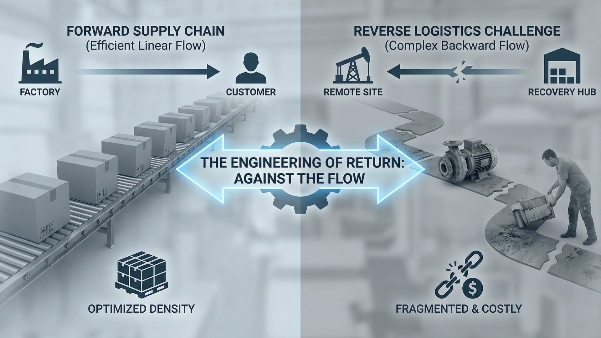 Moving goods forward is easy, but moving them backward is exponentially harder. This article examines the 50% cost premium of reverse logistics, the problem of "deadheading," and the engineering required to retrieve assets from remote sites.