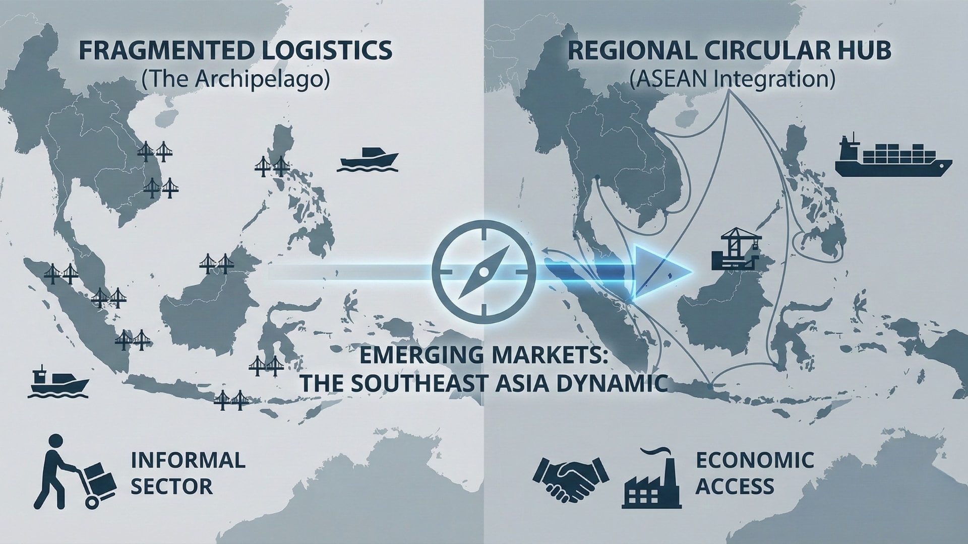 Circular economy models designed for Europe often fail in ASEAN. This article explores the unique logistics of an archipelago, the "China Plus One" effect, and Southeast Asia's rise as a global recovery hub.