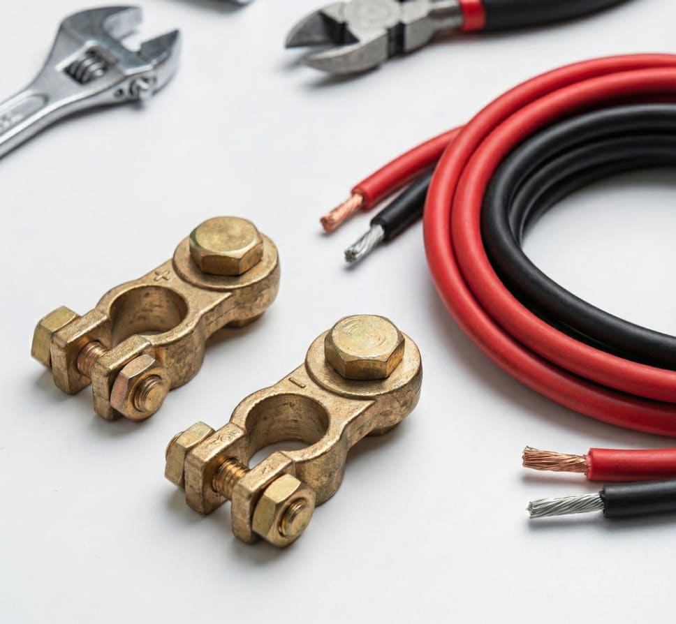 Complete battery terminal set suitable for heavy industrial or automotive batteries. Includes connectors and necessary fittings for secure installation.