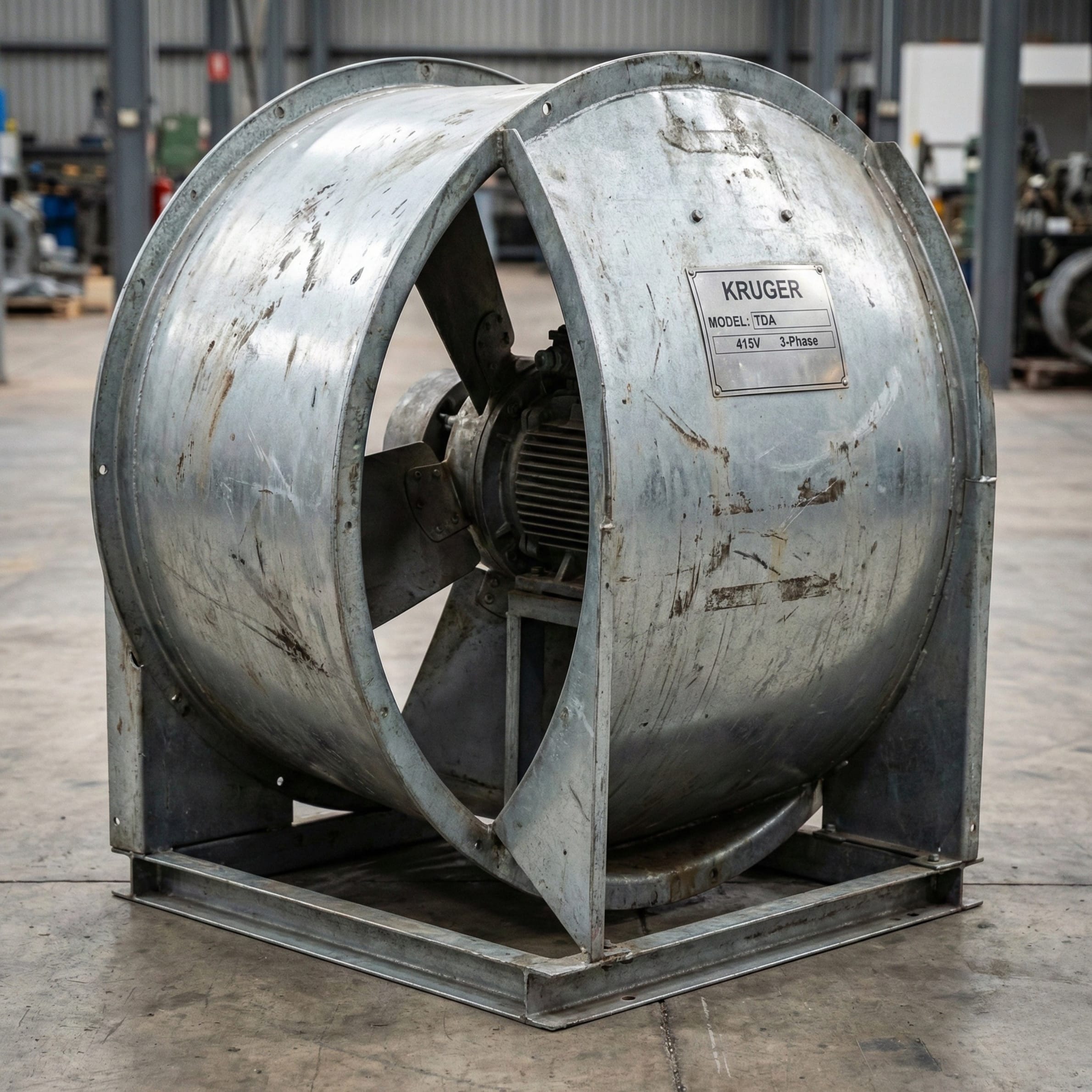 Designed to manage rigorous MEP and utility ventilation requirements, this surplus cylindrical axial flow fan measures 630mm in diameter. It operates via a robust 415V three-phase motor and is fully enclosed within a resilient hot-dipped galvanized steel casing for extended durability.