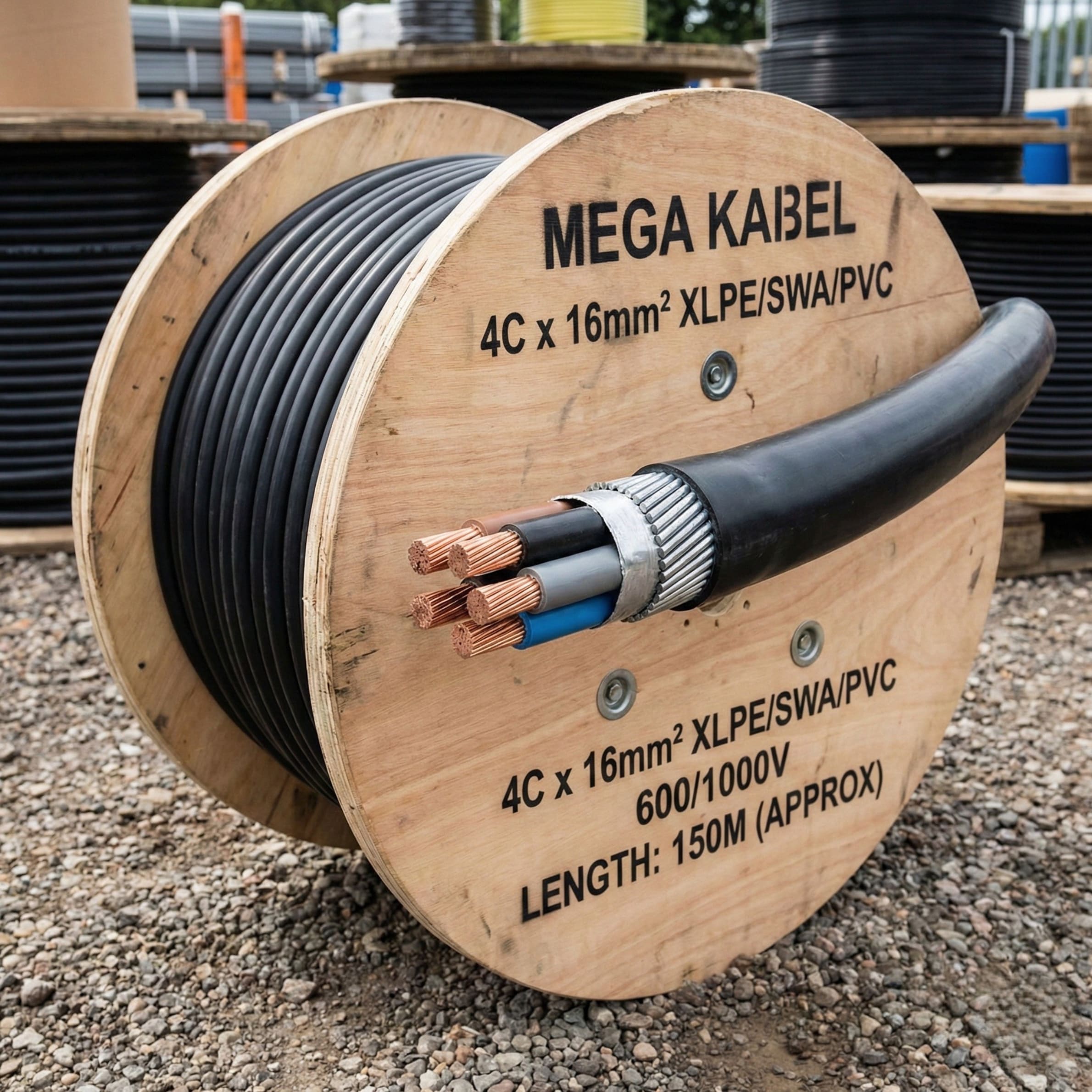 Heavy duty steel wire armored cable used to transmit high voltage power safely underground or across cable trays. It features four copper cores with cross linked polyethylene insulation, rated for up to 1000V. It is sold per partial drum of approximately 150 meters, making it great for main power feeds