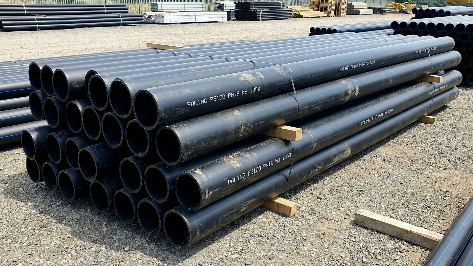 High density polyethylene pipes used for durable and flexible water distribution or industrial fluid transport. Rated for PN16 pressure, these 160mm diameter pipes come in straight 6 meter lengths. They are highly resistant to cracking and chemical corrosion, ensuring a long service life underground.