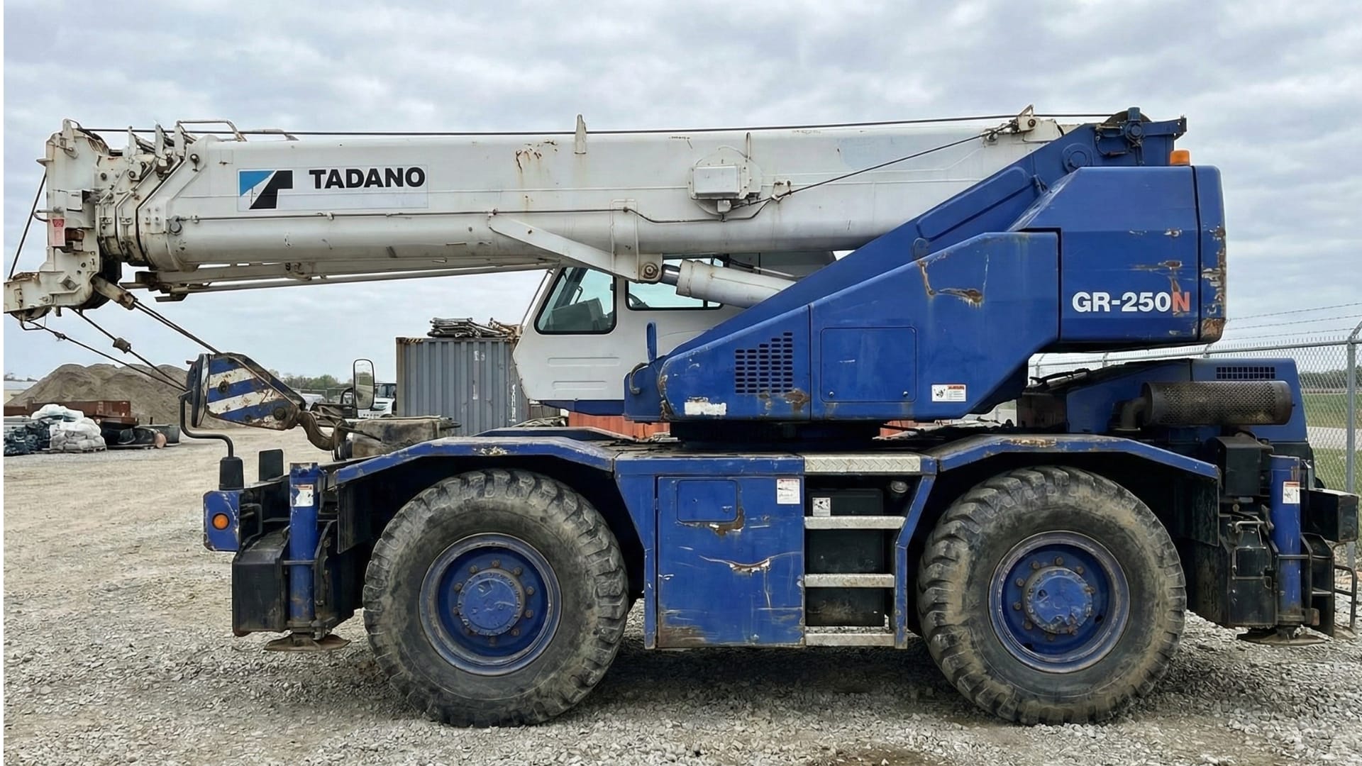 A highly mobile crane capable of traversing rough terrain to lift and place heavy loads safely. It features a maximum lift capacity of 25 tons, a 30.5 meter four section boom, and a 13 meter power jib for extended reach. The built in load moment indicator ensures safe lifting operations on uneven ground.