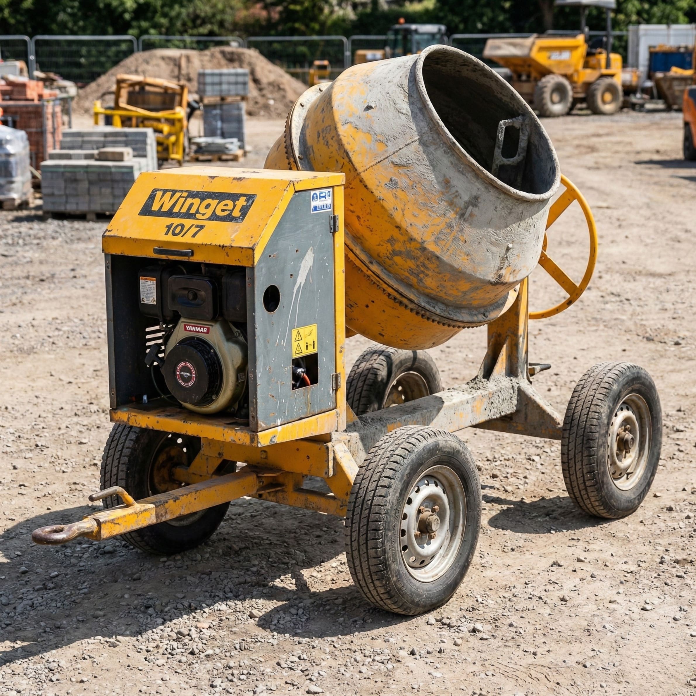This operational heavy machinery mixes foundational materials efficiently using an electric-start Yanmar diesel engine. The reversing drum system handles a 300-liter capacity, effectively mixing 200 liters per batch, all mounted on a highly mobile towable four-wheel chassis